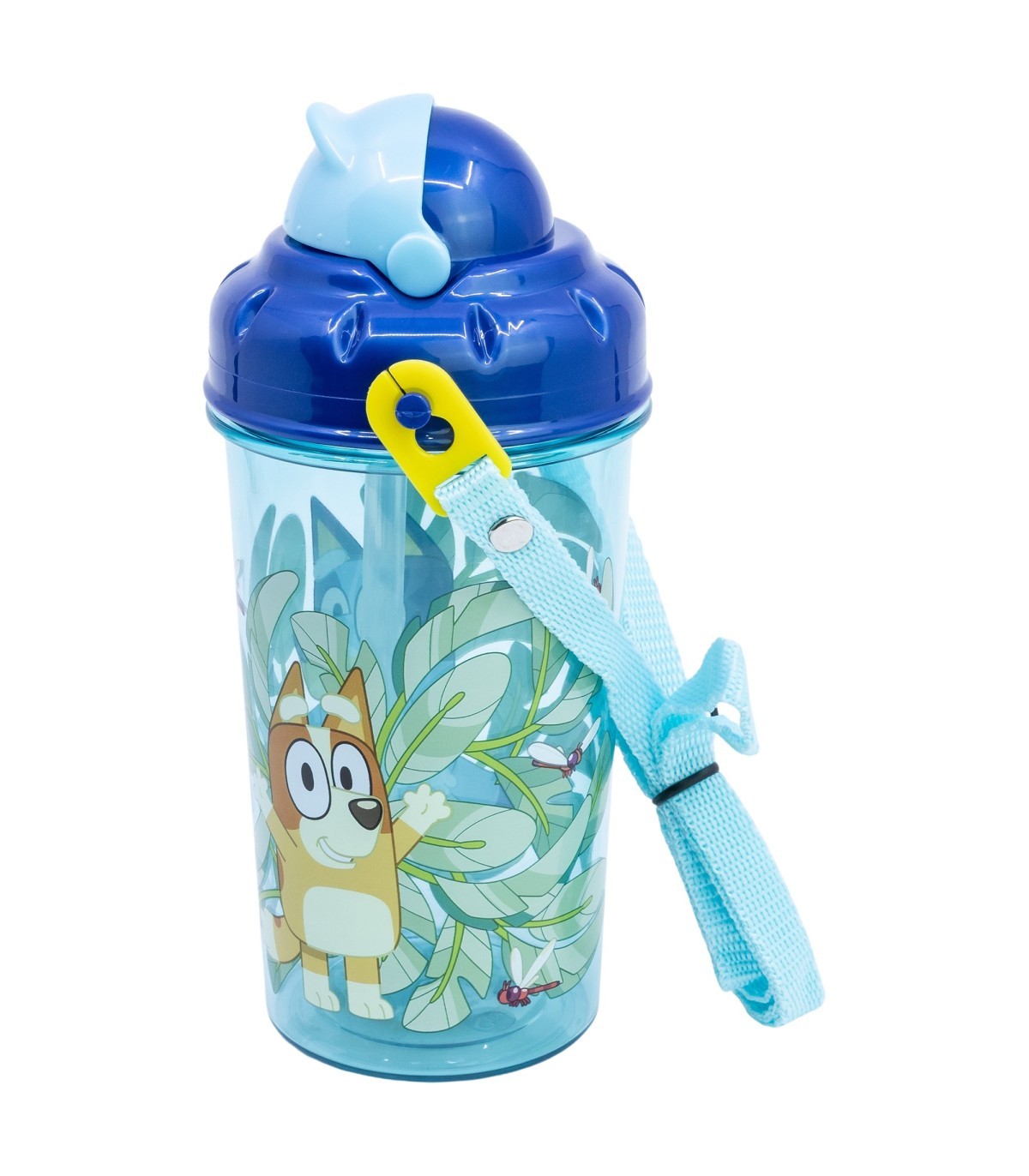 Practical plastic bottle with straw, lid and strap.