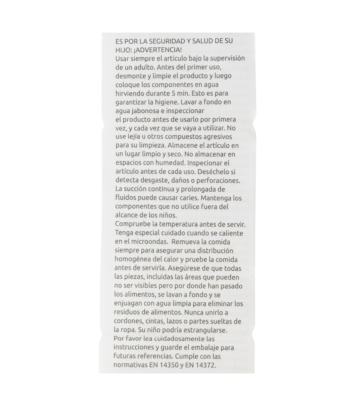 For your child's safety and health: WARNING! Always use this product with adult supervision. Before each use, inspect the product. Throw away at the first sign of damage or weakness. Cleaning, sterilising, storing and use: Wash the product before first use and after each use. Clean the product and its accessories thoroughly with warm soapy water. Do not use bleach or other harsh cleaning products. Store in a dry place, free from dust. Do not expose the product to direct sunlight or heat sources, or leave it in disinfectant ("sterilising solution") for longer than recommended, as this may damage it. Replace the product if it shows cracks, deformations, or changes in colour or texture. Use it according to the indicated recommendations. Improper use or visible damage may compromise its suitability for contact with food. Please read the instructions carefully and keep the packaging for future reference. Safety instructions: Keep components not in use out of the reach of children. Never attach to cords, ribbons, laces or loose parts of clothing. The child can be strangled. Take extra care when microwave heating. Do not overheat the product. Always stir heated food to ensure even heat distribution and test the temperature before serving. EN 14372 standard compliant.