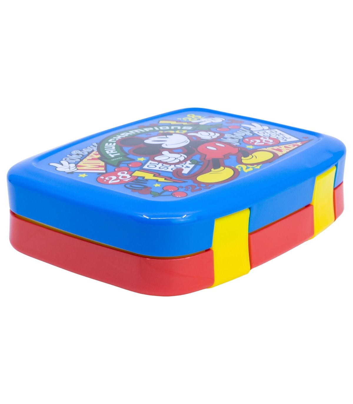 Original robust sandwich box with three compartments on one level and a tray-like compartment below. Made of resistant material, it will withstand the accidental drops and bumps of everyday use and, as it is decorated with attractive designs based on the main characters of their favourite series, the little ones will be delighted to take it with them wherever they go and even use it to store and transport their small toys.