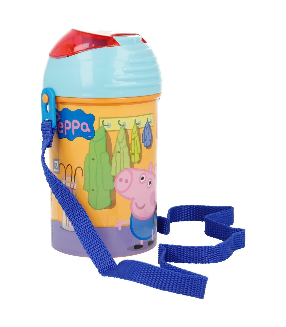 Práctica botella de plástico con un tapón con cierre de seguridad y correas con medidas de seguridad incorporadas.