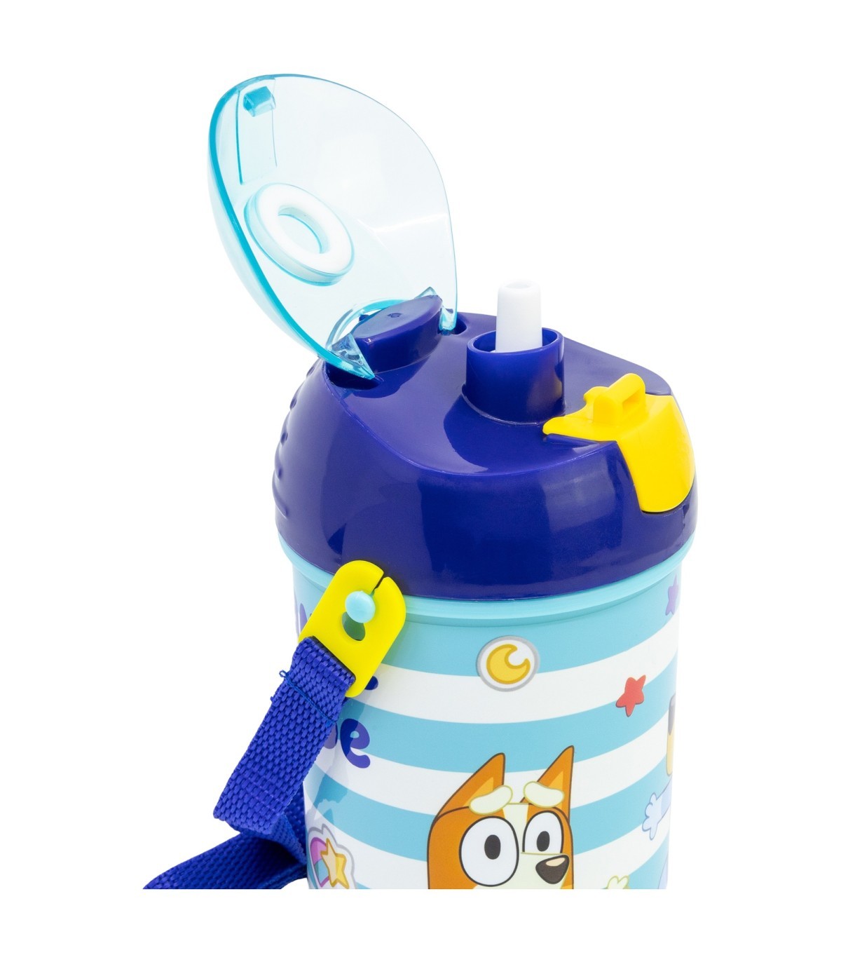 Práctica botella de plástico con un tapón con cierre de seguridad y correas con medidas de seguridad incorporadas.