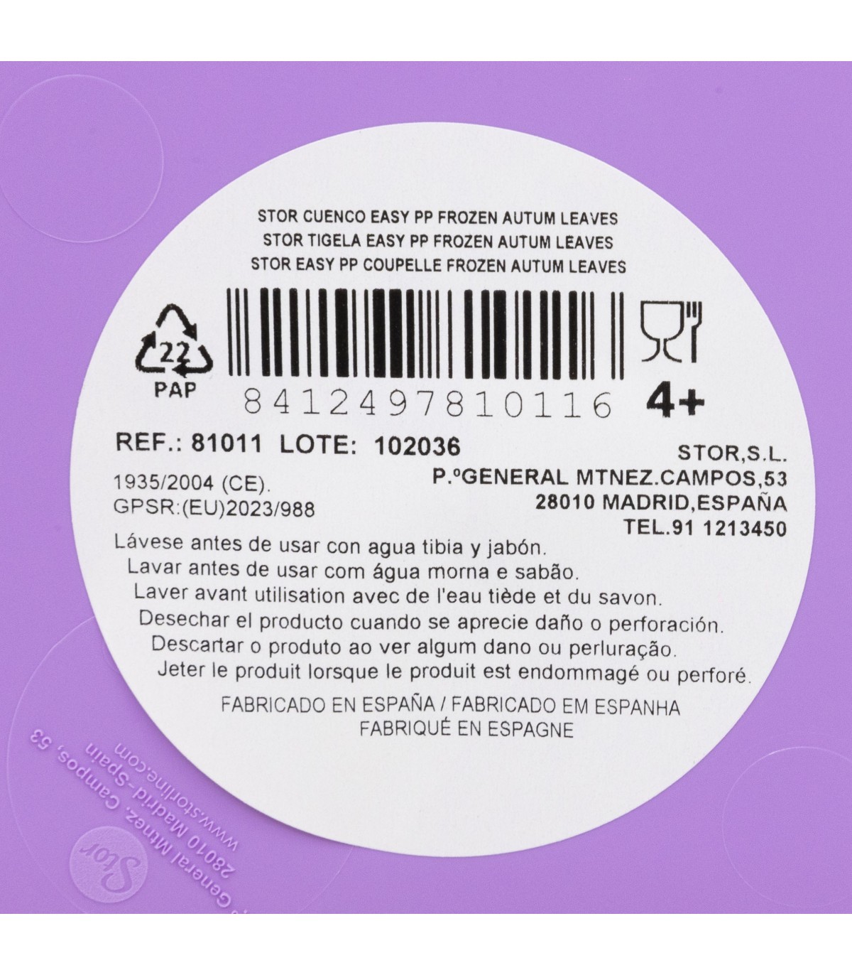 Lave el producto antes del primer uso y después de cada uso. No utilice esponjas abrasivas ni productos químicos agresivos para limpiarlo. Guárdelo en un lugar seco y protegido del polvo. No sobrecalentar el producto. Úselo según las recomendaciones indicadas. Reemplace el producto si presenta grietas, deformaciones o cambios de color o textura. El uso inadecuado o daños visibles pueden comprometer su idoneidad para el contacto con alimentos. Apto para microondas. Apto para lavavajillas. Edad de uso: 4+.