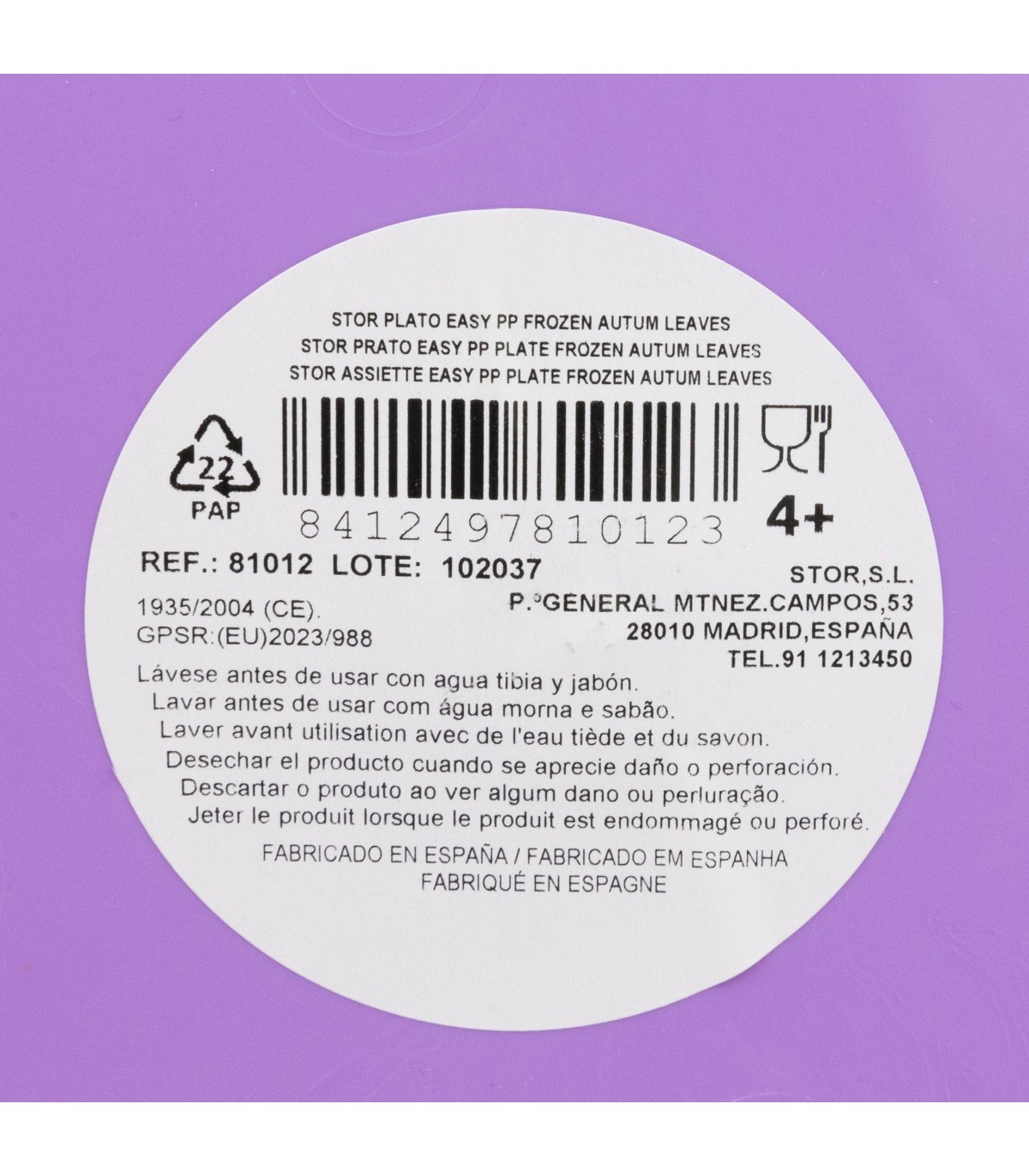 Lave el producto antes del primer uso y después de cada uso. No utilice esponjas abrasivas ni productos químicos agresivos para limpiarlo. Guárdelo en un lugar seco y protegido del polvo. No sobrecalentar el producto. Úselo según las recomendaciones indicadas. Reemplace el producto si presenta grietas, deformaciones o cambios de color o textura. El uso inadecuado o daños visibles pueden comprometer su idoneidad para el contacto con alimentos. Apto para microondas. Apto para lavavajillas. Edad de uso: 4+.