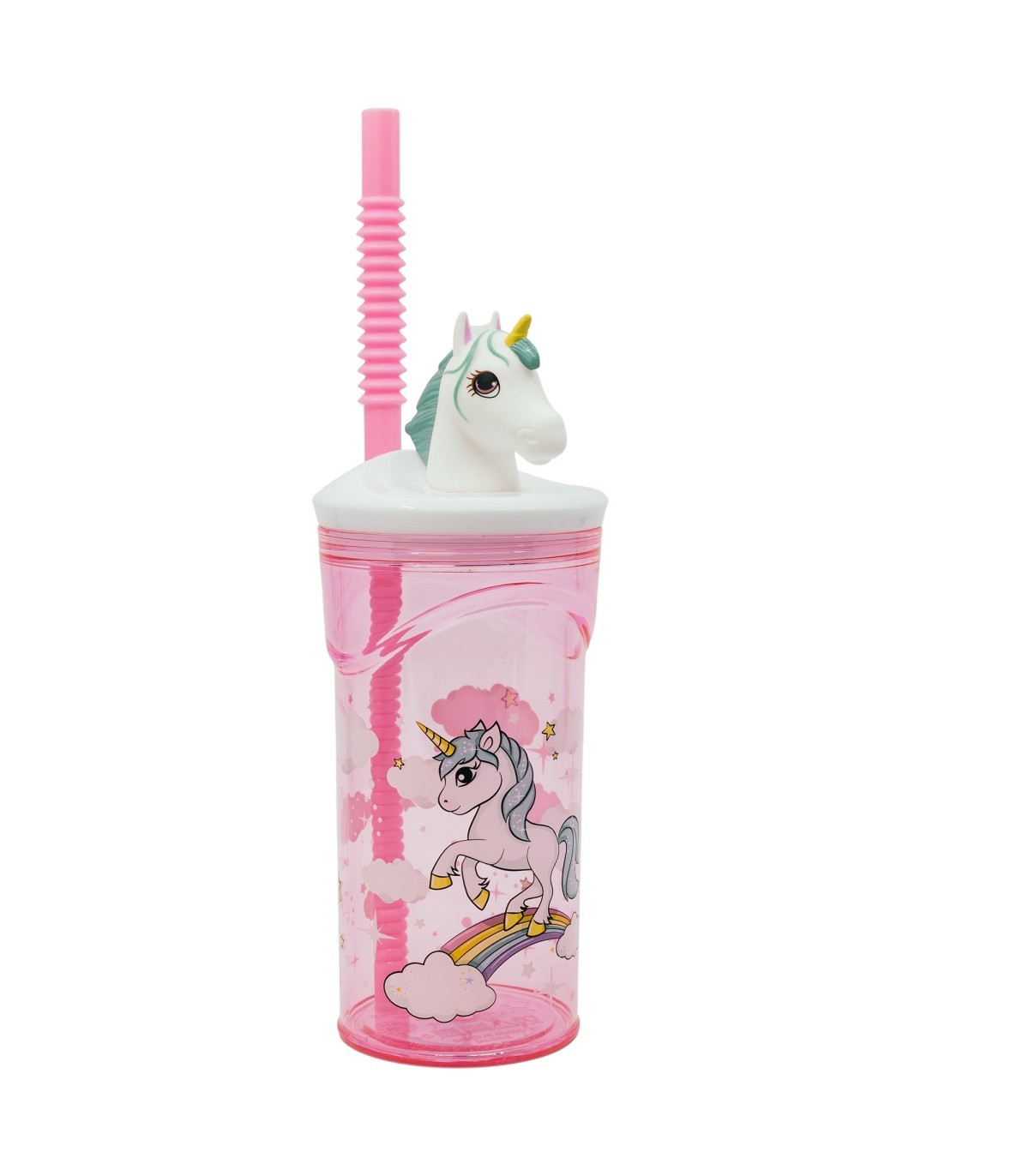 Vaso infantil reutilizable con pajita y tapa con figurita 3D y capacidad de 360 ml de Unicornios y Arco Iris y Arco Iris