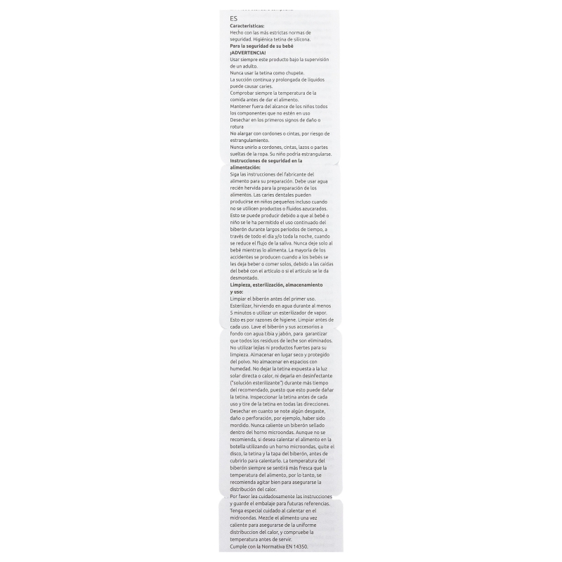 For your babys safety: WARNING! Continuous and prolonged sucking of liquids can cause tooth decay. Discard at the first signs of damage or weakness. Keep all components not in use out of reach of children. Never attach to cords, ribbons, laces, or loose parts of clothing. Your child could be strangled. Always use this product under adult supervision. Cleaning, sterilisation, storage, and use: Clean the product before each use. Wash the product and its accessories thoroughly with warm water and soap. Do not use bleach or other harsh cleaning agents. Store in a dry, dust-free place. Do not expose the product to direct sunlight or heat sources, and do not leave it in disinfectant (sterilising) solutions for longer than recommended, as this may cause damage. Replace the product if it shows any cracks, deformation, or changes in colour or texture. Read the instructions carefully and keep the packaging for future reference. Use only as recommended. Improper use or visible damage may compromise its suitability for food contact. Safety instructions: Tooth decay can occur even without the use of sweetened products or liquids. Never leave your baby unattended while feeding. Most accidents occur when babies are left alone while drinking or eating, due to falls with the item or its disassembly.