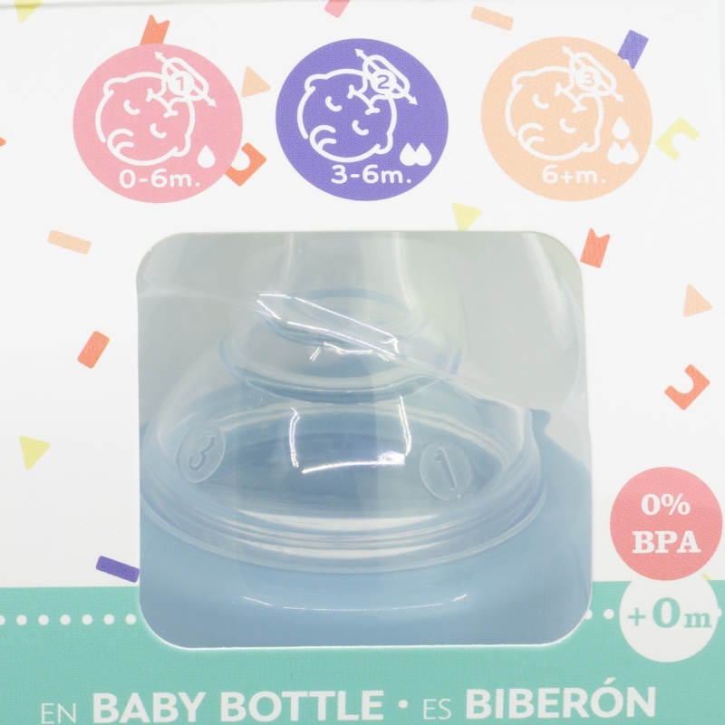 For your child's safety and health: WARNING! Continuous and prolonged sucking of fluids will cause tooth decay. Always check food temperature before feeding. Throw away at the first signs of damage or weakness. Keep components not in use out of the reach of children. Never attach to cords, ribbons, laces or loose parts of clothing. The child can be strangled. Never use feeding teats as a soother. Always use this product with adult supervision. Cleaning, sterilising, storing and use: Clean the product before first use and after each use. For hygiene reasons, sterilise it by boiling the water for at least 5 minutes or use a steam steriliser. Wash the product and its accessories thoroughly with warm water and soap. Do not use bleach or any other aggressive cleaning products. Store in a dry place, protected from dust. Do not leave the teat exposed to direct sunlight or heat or leave it in disinfectant ("sterilising solution") for any longer than the recommended time, as doing so may damage the teat. Inspect the teat before each use, stretching and tugging it in all directions. Throw it away if you detect any wear, damage or perforations (after the baby has bitten it, for example). Replace the product if it shows cracks, deformations, or changes in colour or texture. Improper use or visible damage may compromise its suitability for contact with food. Use it according to the indicated recommendations. Please read the instructions carefully and keep the packaging for future reference. Safety instructions: To prepare the food, follow the food-manufacturer's instructions. Take extra care when microwave heating. Never heat up a sealed product in a microwave oven. Although not recommended, if you choose to use a microwave oven to warm the contents, ensure that only the bottle, tumbler or cup body is placed inside. Remove the disc, teat, cap or any other components before heating. The external temperature of the product may not reflect the actual temperature of its contents. Shake or stir thoroughly after heating to ensure even distribution of heat. Do not overheat the product. Dental caries may occur even when no sweetened products or liquids are used. This may happen if the baby or child is allowed to use the bottle continuously for long periods of time during the day or especially at night, when the saliva level is lower. Never leave the baby to feed alone. Most accidents occur when babies are left to drink or eat alone, because of the baby falling with the article or dismantling it. EN 14350:2020+A1:2023 standard compliant.
