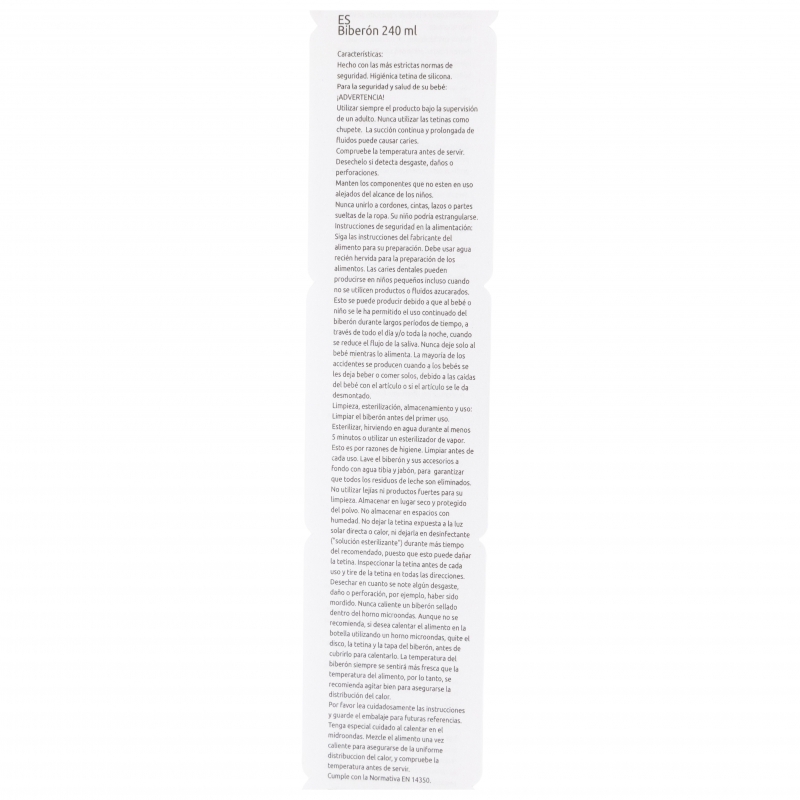 For your child's safety and health: WARNING! Continuous and prolonged sucking of fluids will cause tooth decay. Always check food temperature before feeding. Throw away at the first signs of damage or weakness. Keep components not in use out of the reach of children. Never attach to cords, ribbons, laces or loose parts of clothing. The child can be strangled. Never use feeding teats as a soother. Always use this product with adult supervision. Cleaning, sterilising, storing and use: Clean the product before first use and after each use. For hygiene reasons, sterilise it by boiling the water for at least 5 minutes or use a steam steriliser. Wash the product and its accessories thoroughly with warm water and soap. Do not use bleach or any other aggressive cleaning products. Store in a dry place, protected from dust. Do not leave the teat exposed to direct sunlight or heat or leave it in disinfectant ("sterilising solution") for any longer than the recommended time, as doing so may damage the teat. Inspect the teat before each use, stretching and tugging it in all directions. Throw it away if you detect any wear, damage or perforations (after the baby has bitten it, for example). Replace the product if it shows cracks, deformations, or changes in colour or texture. Improper use or visible damage may compromise its suitability for contact with food. Use it according to the indicated recommendations. Please read the instructions carefully and keep the packaging for future reference. Safety instructions: To prepare the food, follow the food-manufacturer's instructions. Take extra care when microwave heating. Never heat up a sealed product in a microwave oven. Although not recommended, if you choose to use a microwave oven to warm the contents, ensure that only the bottle, tumbler or cup body is placed inside. Remove the disc, teat, cap or any other components before heating. The external temperature of the product may not reflect the actual temperature of its contents. Shake or stir thoroughly after heating to ensure even distribution of heat. Do not overheat the product. Dental caries may occur even when no sweetened products or liquids are used. This may happen if the baby or child is allowed to use the bottle continuously for long periods of time during the day or especially at night, when the saliva level is lower. Never leave the baby to feed alone. Most accidents occur when babies are left to drink or eat alone, because of the baby falling with the article or dismantling it. EN 14350:2020+A1:2023 standard compliant.