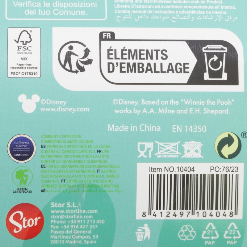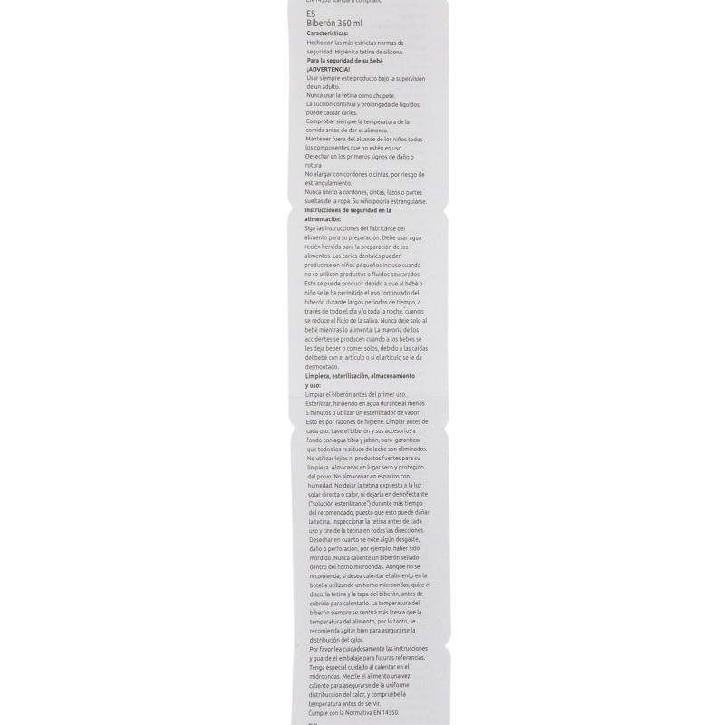 Para la seguridad de su bebé: ¡ADVERTENCIA! La succión continua y prolongada de líquidos puede causar caries. Comprobar siempre la temperatura de la comida antes de dar el alimento. Desechar en los primeros signos de daño o rotura. Mantener fuera del alcance de los niños todos los componentes que no estén en uso. Nunca unirlo a cordones, cintas, lazos o partes sueltas de la ropa. Su niño podría estrangularse. Nunca usar la tetina como chupete. Usar siempre este producto bajo la supervisión de un adulto. Limpieza, esterilización, almacenamiento y uso: Limpie el producto antes del primer uso y después de cada uso. Por razones de higiene, esterilícelo hirviéndolo en agua durante al menos 5 minutos o utilizando un esterilizador de vapor. Lave el producto y sus accesorios cuidadosamente con agua tibia y jabón. No utilice lejía ni otros productos de limpieza agresivos. Guárdelo en un lugar seco y libre de polvo. No exponga la tetina a la luz solar directa ni a fuentes de calor, ni la deje en desinfectantes ("soluciones esterilizantes") por más tiempo del recomendado, ya que podría dañarse. Inspeccione la tetina antes de cada uso, estirándola y tirando de ella en todas las direcciones. Deséchela si detecta signos de desgaste, daños o perforaciones (por ejemplo, si el bebé la ha mordido). Sustituya el producto si presenta grietas, deformaciones o cambios en el color o la textura. Úselo de acuerdo con las recomendaciones indicadas. El uso inadecuado o los daños visibles pueden comprometer su idoneidad para el contacto con alimentos. Lea atentamente las instrucciones y conserve el envase para futuras consultas. Instrucciones de seguridad: Para preparar los alimentos, siga las instrucciones del fabricante. Tenga especial cuidado al calentar en el microondas. Nunca caliente un producto cerrado en el microondas. Aunque no se recomienda, si decide usar el microondas para calentar el contenido, asegúrese de introducir solo el cuerpo del biberón, vaso o taza. Retire el disco, tetina, tapa o cualquier otro componente antes de calentar. La temperatura exterior del producto puede no reflejar la temperatura real de su contenido. Agite o remueva bien después de calentar para garantizar una distribución uniforme del calor. No sobrecaliente el producto. Las caries dentales pueden producirse incluso sin uso de productos o líquidos azucarados. Esto puede ocurrir si se permite que el bebé o niño utilice el biberón de forma continua durante largos periodos del día o, especialmente, durante la noche, cuando el nivel de saliva es menor. Nunca deje al bebé alimentarse solo. La mayoría de los accidentes ocurren cuando los bebés son dejados solos mientras beben o comen, debido a caídas con el artículo o a su desmontaje. Cumple con la norma EN 14350:2020+A1:2023.