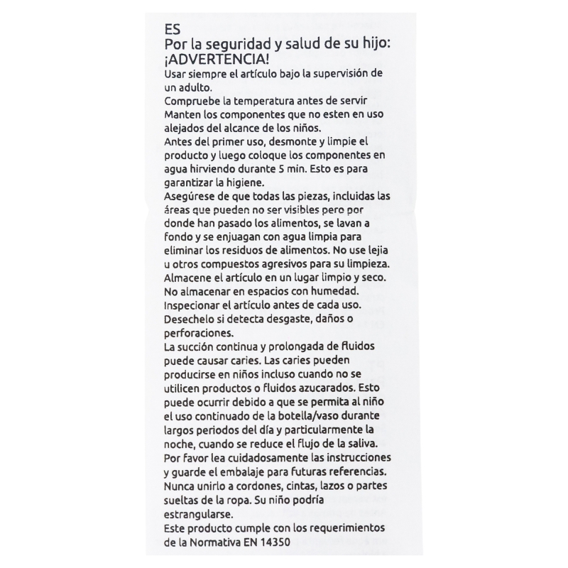 For your child's safety and health: WARNING! Always use this product with adult supervision. Before each use, inspect the product. Throw away at the first sign of damage or weakness. Cleaning, sterilising, storing and use: Wash the product before first use and after each use. Clean the product and its accessories thoroughly with warm soapy water. Do not use bleach or other harsh cleaning products. Store in a dry place, free from dust. Do not expose the product to direct sunlight or heat sources, or leave it in disinfectant ("sterilising solution") for longer than recommended, as this may damage it. Replace the product if it shows cracks, deformations, or changes in colour or texture. Use it according to the indicated recommendations. Improper use or visible damage may compromise its suitability for contact with food. Please read the instructions carefully and keep the packaging for future reference. Safety instructions: Keep components not in use out of the reach of children. Never attach to cords, ribbons, laces or loose parts of clothing. The child can be strangled. Take extra care when microwave heating. Do not overheat the product. Always stir heated food to ensure even heat distribution and test the temperature before serving. EN 14372 standard compliant.