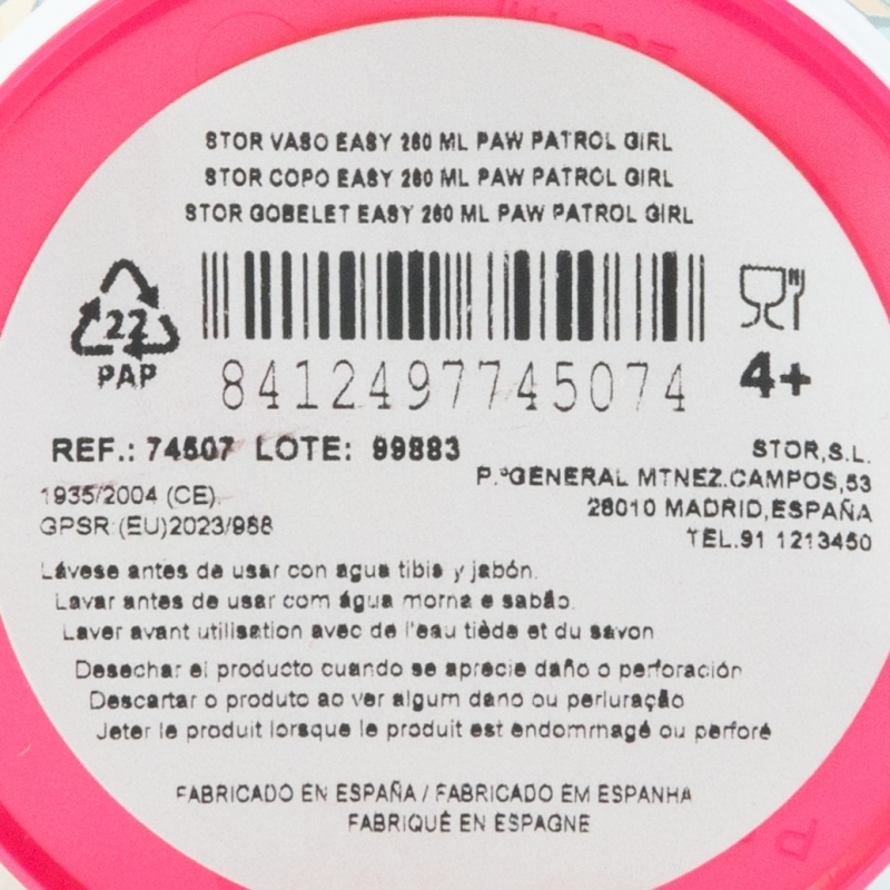 Vaso infantil de plástico reutilizable de 260 ml de La Patrulla Canina ChicasDestinatario :