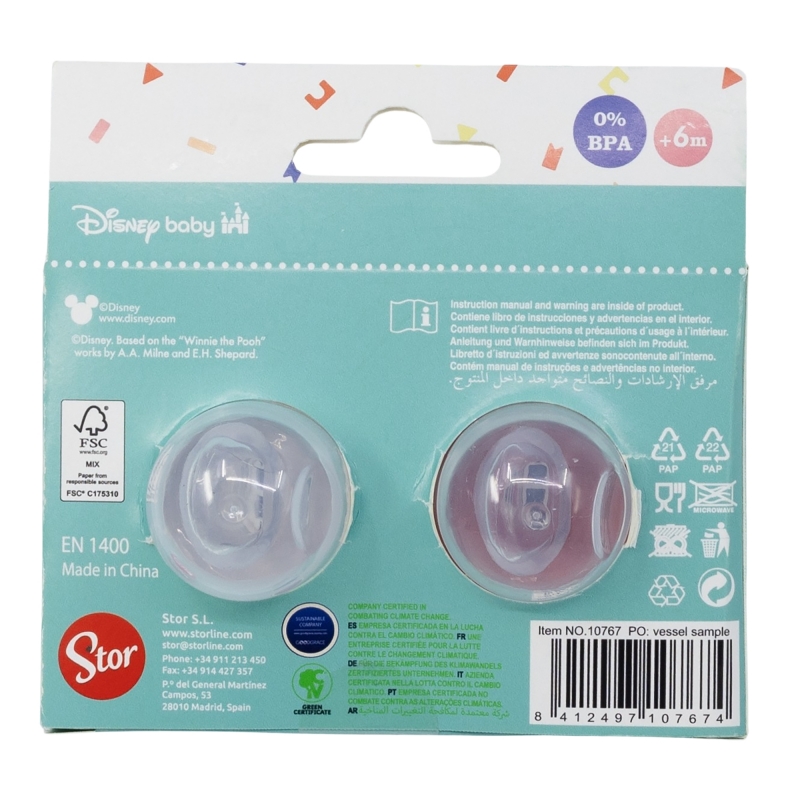 Para la seguridad de su bebé: ¡ADVERTENCIA! Inspecciónelo atentamente antes de cada uso. Tire del chupete en todas las direcciones. Deseche el chupete al primer signo de deterioro o fragilidad. Utilice sólo broches para chupetes probados según la Norma EN 12586. Nunca unir el chupete a otras cintas o cordeles, su bebé podría estrangularse con ellas. Mantener el protector separable de la tetina fuera del alcance de los niños para evitar el riesgo de asfixia. Limpieza, esterilización, almacenamiento y uso: Antes de usar el chupete por primera vez, colóquelo en agua hirviendo durante cinco minutos, déjelo enfriar y presione la tetina para eliminar cualquier resto de agua (por razones de higiene). Limpie el chupete antes de cada uso. Lávelo cuidadosamente con agua caliente y jabón, o con una solución esterilizante (siguiendo las instrucciones del fabricante). No lo limpie con productos abrasivos o disolventes, ya que podrían dañar el chupete. Guárdelo seco, preferiblemente en un recipiente cerrado. No exponga el chupete a la luz solar directa ni a ninguna fuente de calor, ya que podría debilitar la tetina. Sustituya el chupete entre uno y dos meses de uso, por razones de seguridad e higiene. Sustituya el producto si presenta grietas, deformaciones o cambios en el color o la textura. No lo desmonte. Recomendaciones de seguridad: No sumerja nunca la tetina en sustancias dulces ni medicamentos, ya que puede causar caries dental. Si el chupete se queda atascado en la boca del bebé, NO SE ALARME. El chupete no puede tragarse y ha sido diseñado para que estas situaciones se resuelvan fácilmente. Extraiga el chupete con la mayor suavidad y cuidado posible. Utilícelo siguiendo las recomendaciones indicadas. Lea atentamente las instrucciones y conserve el embalaje para futuras consultas. Cumple con la norma EN 1400:2023.