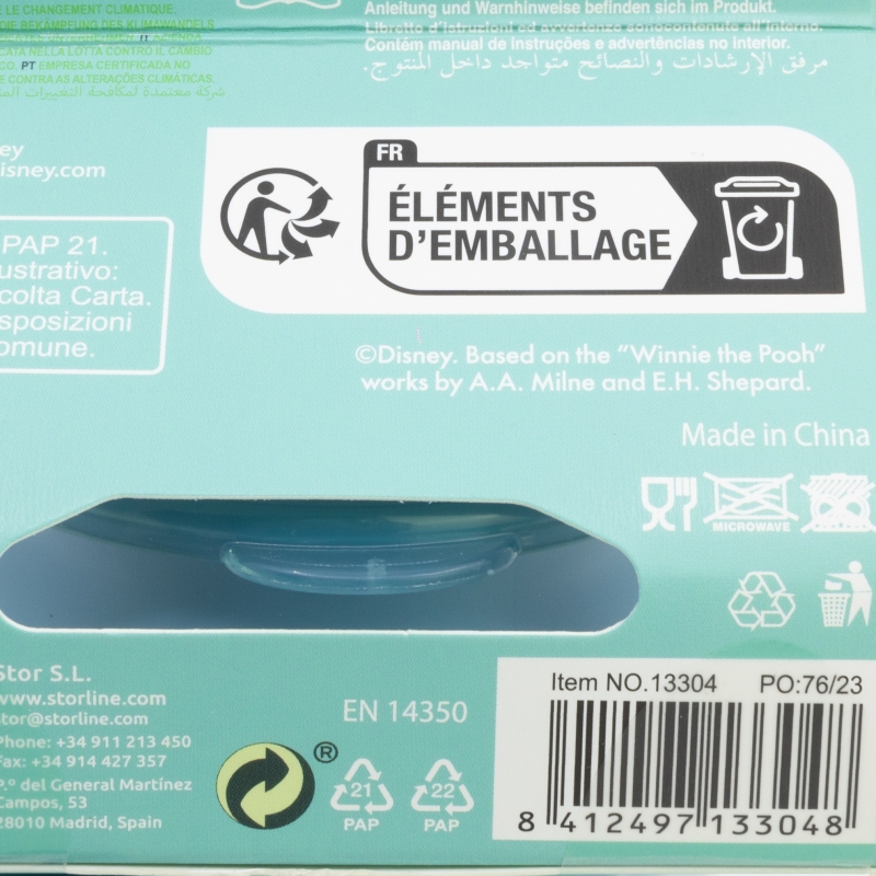 Para la seguridad de su bebé: ¡ADVERTENCIA! La succión continua y prolongada de líquidos puede causar caries. Comprobar siempre la temperatura de la comida antes de dar el alimento. Desechar en los primeros signos de daño o rotura. Mantener fuera del alcance de los niños todos los componentes que no estén en uso. Nunca unirlo a cordones, cintas, lazos o partes sueltas de la ropa. Su niño podría estrangularse. Usar siempre este producto bajo la supervisión de un adulto. Limpieza, esterilización, almacenamiento y uso: Limpie el producto antes del primer uso y después de cada uso. Por razones de higiene, esterilícelo hirviéndolo en agua durante al menos 5 minutos o utilizando un esterilizador de vapor. Lave el producto y sus accesorios cuidadosamente con agua tibia y jabón. No utilice lejía ni otros productos de limpieza agresivos. Guárdelo en un lugar seco y libre de polvo. No exponga el producto a la luz solar directa ni a fuentes de calor, ni lo deje en desinfectantes ("soluciones esterilizantes") por más tiempo del recomendado. Sustituya el producto si presenta grietas, deformaciones o cambios en el color o la textura. Lea atentamente las instrucciones y conserve el envase para futuras consultas. Úselo de acuerdo con las recomendaciones indicadas. El uso inadecuado o los daños visibles pueden comprometer su idoneidad para el contacto con alimentos. Instrucciones de seguridad: Para preparar los alimentos, siga las instrucciones del fabricante. Tenga especial cuidado al calentar en el microondas. Nunca caliente un producto cerrado en el microondas. Aunque no se recomienda, si decide usar el microondas para calentar el contenido, asegúrese de introducir solo el cuerpo del biberón, vaso o taza. Retire el disco, la tapa o cualquier otro componente antes de calentar. La temperatura exterior del producto puede no reflejar la temperatura real de su contenido. Agite o remueva bien después de calentar para garantizar una distribución uniforme del calor. No sobrecaliente el producto. Las caries dentales pueden producirse incluso sin uso de productos o líquidos azucarados. Esto puede ocurrir si se permite que el bebé o niño utilice el biberón de forma continua durante largos periodos del día o, especialmente, durante la noche, cuando el nivel de saliva es menor. Nunca deje al bebé alimentarse solo. La mayoría de los accidentes ocurren cuando los bebés son dejados solos mientras beben o comen, debido a caídas con el artículo o a su desmontaje. Cumple con la norma EN 14350:2020+A1:2023.