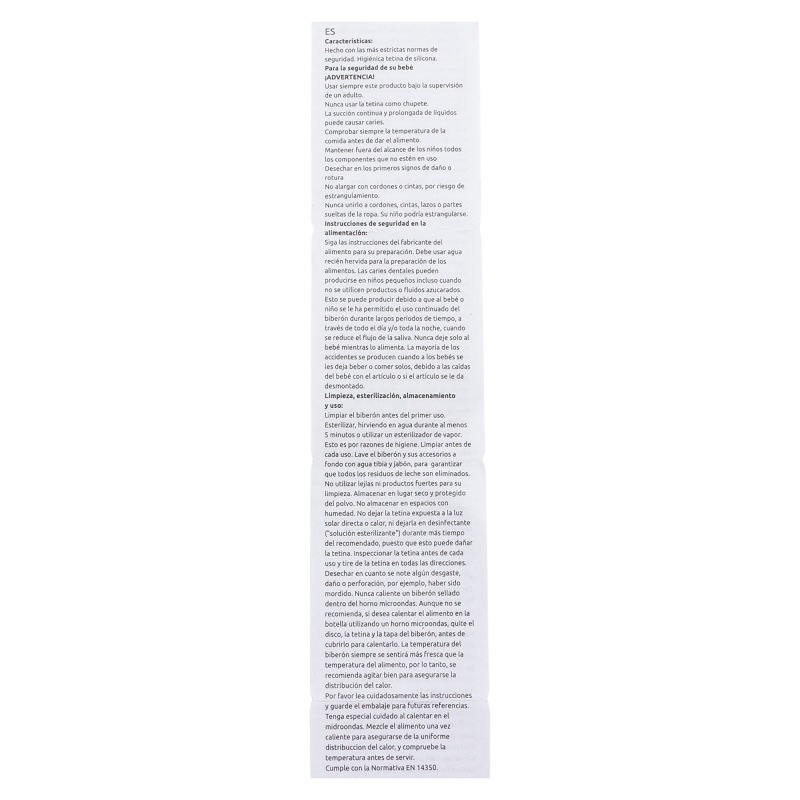 For your child's safety and health: WARNING! Continuous and prolonged sucking of fluids will cause tooth decay. Always check food temperature before feeding. Throw away at the first signs of damage or weakness. Keep components not in use out of the reach of children. Never attach to cords, ribbons, laces or loose parts of clothing. The child can be strangled. Never use feeding teats as a soother. Always use this product with adult supervision. Cleaning, sterilising, storing and use: Clean the product before first use and after each use. For hygiene reasons, sterilise it by boiling the water for at least 5 minutes or use a steam steriliser. Wash the product and its accessories thoroughly with warm water and soap. Do not use bleach or any other aggressive cleaning products. Store in a dry place, protected from dust. Do not leave the teat exposed to direct sunlight or heat or leave it in disinfectant ("sterilising solution") for any longer than the recommended time, as doing so may damage the teat. Inspect the teat before each use, stretching and tugging it in all directions. Throw it away if you detect any wear, damage or perforations (after the baby has bitten it, for example). Replace the product if it shows cracks, deformations, or changes in colour or texture. Improper use or visible damage may compromise its suitability for contact with food. Use it according to the indicated recommendations. Please read the instructions carefully and keep the packaging for future reference. Safety instructions: To prepare the food, follow the food-manufacturer's instructions. Take extra care when microwave heating. Never heat up a sealed product in a microwave oven. Although not recommended, if you choose to use a microwave oven to warm the contents, ensure that only the bottle, tumbler or cup body is placed inside. Remove the disc, teat, cap or any other components before heating. The external temperature of the product may not reflect the actual temperature of its contents. Shake or stir thoroughly after heating to ensure even distribution of heat. Do not overheat the product. Dental caries may occur even when no sweetened products or liquids are used. This may happen if the baby or child is allowed to use the bottle continuously for long periods of time during the day or especially at night, when the saliva level is lower. Never leave the baby to feed alone. Most accidents occur when babies are left to drink or eat alone, because of the baby falling with the article or dismantling it. EN 14350:2020+A1:2023 standard compliant.
