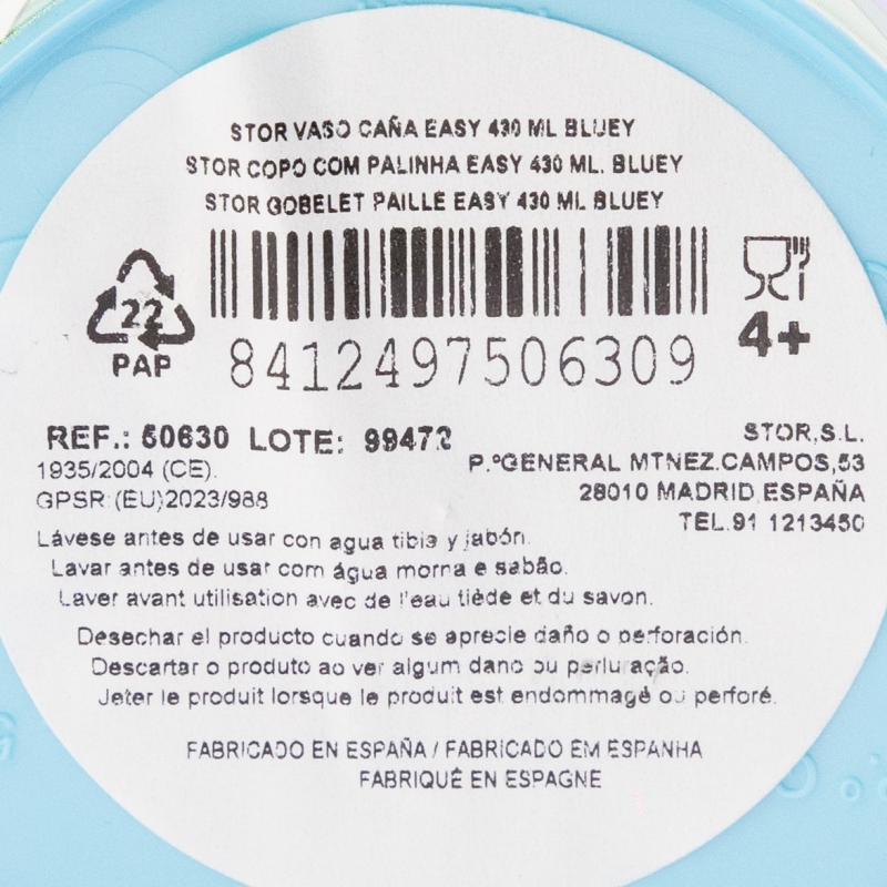 Lave el producto antes del primer uso y después de cada uso. No utilice esponjas abrasivas ni productos químicos agresivos para limpiarlo. Guárdelo en un lugar seco y protegido del polvo. No sobrecalentar el producto. Úselo según las recomendaciones indicadas. Reemplace el producto si presenta grietas, deformaciones o cambios de color o textura. El uso inadecuado o daños visibles pueden comprometer su idoneidad para el contacto con alimentos. No apto para microondas. No apto para lavavajillas. Edad de uso: 4+.