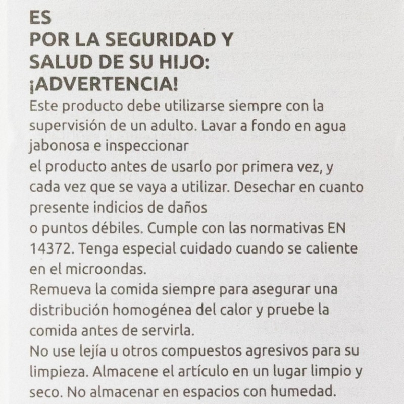 For your child's safety and health: WARNING! Always use this product with adult supervision. Before each use, inspect the product. Throw away at the first sign of damage or weakness. Cleaning, sterilising, storing and use: Wash the product before first use and after each use. Clean the product and its accessories thoroughly with warm soapy water. Do not use bleach or other harsh cleaning products. Store in a dry place, free from dust. Do not expose the product to direct sunlight or heat sources, or leave it in disinfectant ("sterilising solution") for longer than recommended, as this may damage it. Replace the product if it shows cracks, deformations, or changes in colour or texture. Use it according to the indicated recommendations. Improper use or visible damage may compromise its suitability for contact with food. Please read the instructions carefully and keep the packaging for future reference. Safety instructions: Keep components not in use out of the reach of children. Never attach to cords, ribbons, laces or loose parts of clothing. The child can be strangled. Take extra care when microwave heating. Do not overheat the product. Always stir heated food to ensure even heat distribution and test the temperature before serving. EN 14372 standard compliant.