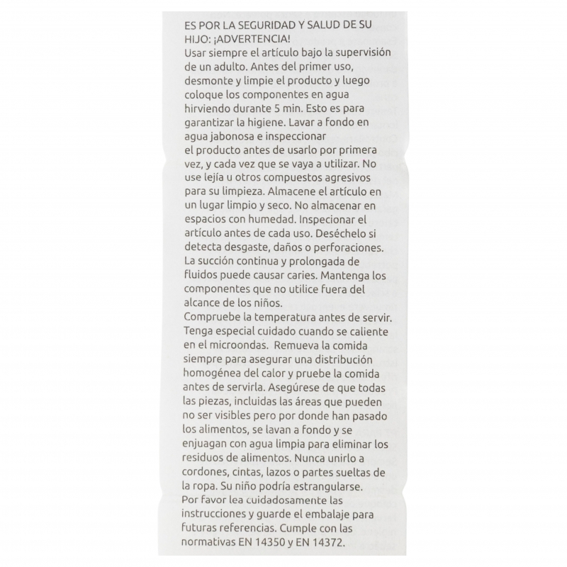 For your child's safety and health: WARNING! Always use this product with adult supervision. Before each use, inspect the product. Throw away at the first sign of damage or weakness. Cleaning, sterilising, storing and use: Wash the product before first use and after each use. Clean the product and its accessories thoroughly with warm soapy water. Do not use bleach or other harsh cleaning products. Store in a dry place, free from dust. Do not expose the product to direct sunlight or heat sources, or leave it in disinfectant ("sterilising solution") for longer than recommended, as this may damage it. Replace the product if it shows cracks, deformations, or changes in colour or texture. Use it according to the indicated recommendations. Improper use or visible damage may compromise its suitability for contact with food. Please read the instructions carefully and keep the packaging for future reference. Safety instructions: Keep components not in use out of the reach of children. Never attach to cords, ribbons, laces or loose parts of clothing. The child can be strangled. Take extra care when microwave heating. Do not overheat the product. Always stir heated food to ensure even heat distribution and test the temperature before serving. EN 14372 standard compliant.