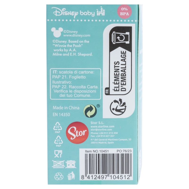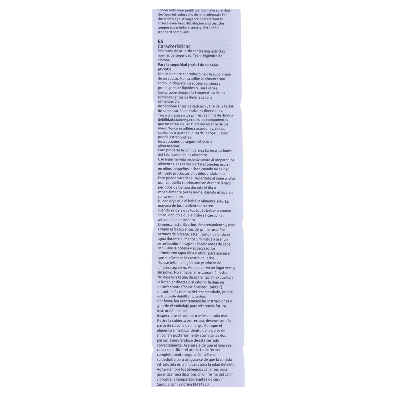 Para la seguridad de su bebé: ¡ADVERTENCIA! La succión continua y prolongada de líquidos puede causar caries. Desechar en los primeros signos de daño o rotura Mantener fuera del alcance de los niños todos los componentes que no estén en uso Nunca unirlo a cordones, cintas, lazos o partes sueltas de la ropa. Su niño podría estrangularse. Usar siempre este producto bajo la supervisión de un adulto. Limpieza, esterilización, almacenamiento y uso: Limpie el producto antes de cada uso. Lave el producto y sus accesorios cuidadosamente con agua tibia y jabón. No utilice lejía ni otros productos de limpieza agresivos. Guárdelo en un lugar seco y libre de polvo. No exponga el producto a la luz solar directa ni a fuentes de calor, ni la deje en desinfectantes ("soluciones esterilizantes") por más tiempo del recomendado, ya que podría dañarse. Sustituya el producto si presenta grietas, deformaciones o cambios en el color o la textura. Lea atentamente las instrucciones y conserve el envase para futuras consultas. Úselo de acuerdo con las recomendaciones indicadas. El uso inadecuado o los daños visibles pueden comprometer su idoneidad para el contacto con alimentos. Instrucciones de seguridad: Las caries dentales pueden producirse incluso sin uso de productos o líquidos azucarados. Nunca deje al bebé alimentarse solo. La mayoría de los accidentes ocurren cuando los bebés son dejados solos mientras beben o comen, debido a caídas con el artículo o a su desmontaje.