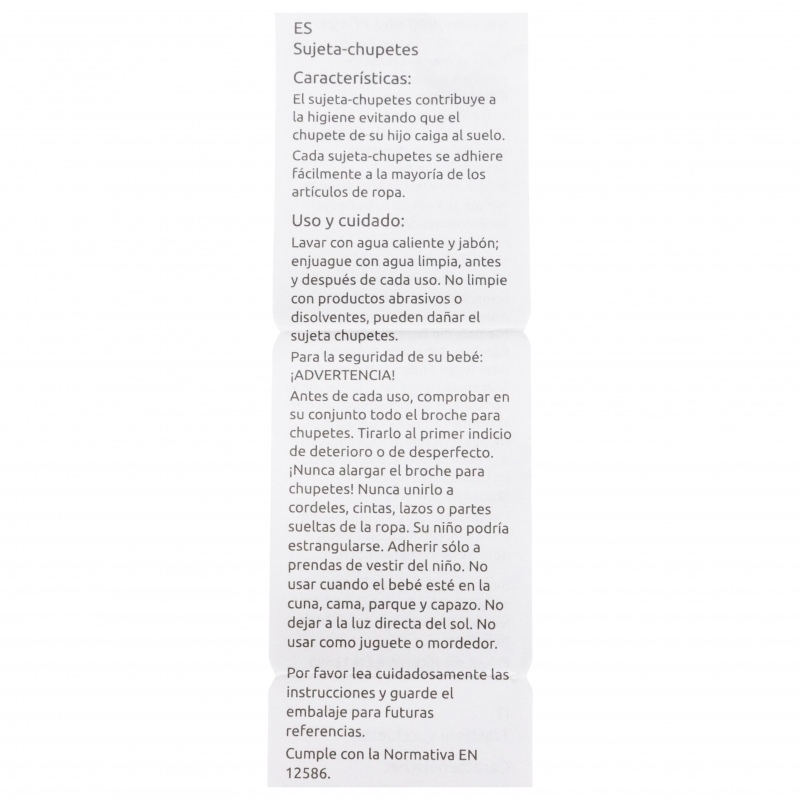 For your child´s safety: WARNING! Before each use check the soother holder carefully. Throw away at the first sign of damage or weakness. Never lengthen the soother holder! Never attach to cords, ribbons, laces or loose parts of clothing. The child can be strangled. Cleaning, sterilising, storing and use: Wash the product before first use and after each use. Clean using warm soapy water. Do not use abrasive sponges or harsh chemicals for cleaning. Store in a dry place, protected from dust. Do not leave the product exposed to direct sunlight or heat or leave it in disinfectant ("sterilising solution") for any longer than the recommended time. Replace the product if it shows cracks, deformations, or changes in colour or texture. Safety instructions: Sticks only to the childs clothing. Do not use when the baby is in a crib, bed, playpen or pram. This product is NOT A TOY. Keep components not in use out of the reach of children. Use it according to the indicated recommendations. Please read the instructions carefully and keep the packaging for future reference. EN 12586:2025 standard compliant.