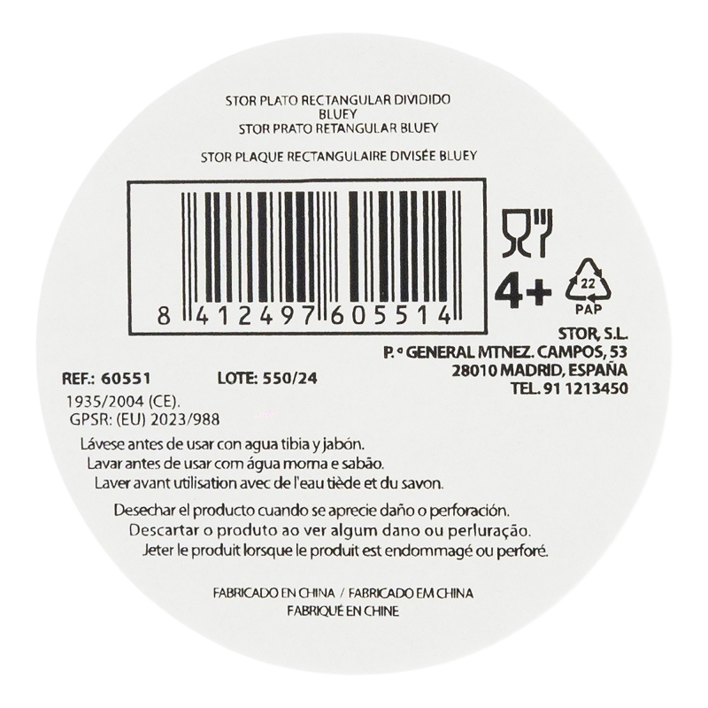 Lave el producto antes del primer uso y después de cada uso. No utilice esponjas abrasivas ni productos químicos agresivos para limpiarlo. Guárdelo en un lugar seco y protegido del polvo. No sobrecalentar el producto. Úselo según las recomendaciones indicadas. Reemplace el producto si presenta grietas, deformaciones o cambios de color o textura. El uso inadecuado o daños visibles pueden comprometer su idoneidad para el contacto con alimentos. Apto para microondas. Apto para lavavajillas. Edad de uso: 4+.