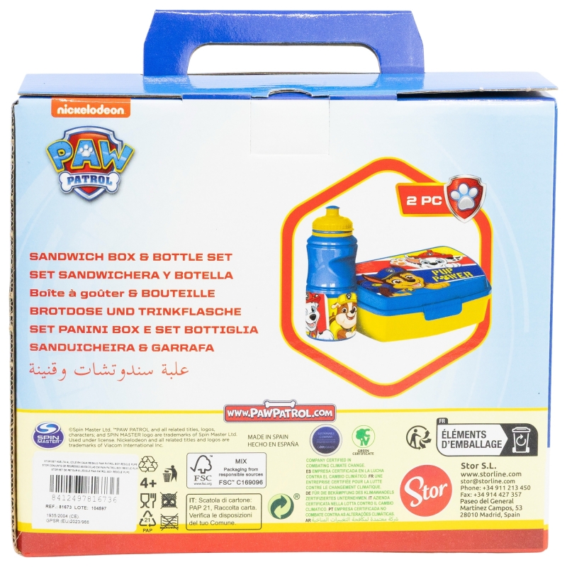 SET VUELTA AL COLE (SANDWICHERA RECTANGULAR Y BOTELLA SPORT EASY HOLD 380 ML) EN CAJA REGALO PAW PATROL BOY RESCUE PUPS