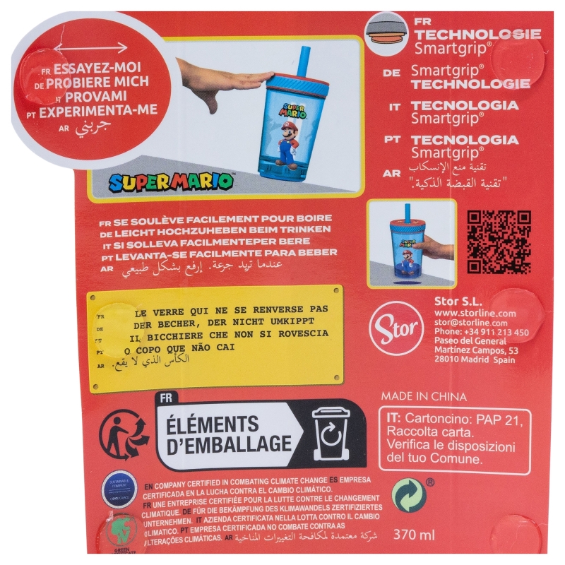 Vaso de plástico con pajita de silicona con sistema de antivuelco Smartgrip que se sujeta a cualquier superficie lisa. Smartgrip no deja que se vuelque, pero sí que se pueda levantar en cualquier momento. Decorada con originales diseños basados en algunos de los personajes más conocidos del mundo del cine y la televisión. Un producto muy funcional que nunca pasa de moda. Ideal tanto para regalo como para uso diario. - Licencias oficiales - Capacidad: 370 ml Lave el producto antes del primer uso y después de cada uso. No utilice esponjas abrasivas ni productos químicos agresivos para limpiarlo. Guárdelo en un lugar seco y protegido del polvo. No sobrecalentar el producto. Úselo según las recomendaciones indicadas. Reemplace el producto si presenta grietas, deformaciones o cambios de color o textura. El uso inadecuado o daños visibles pueden comprometer su idoneidad para el contacto con alimentos. No apto para microondas. No apto para lavavajillas. Edad de uso: 4+.
